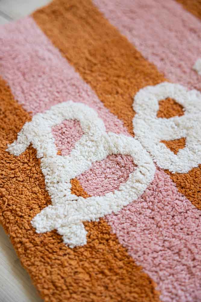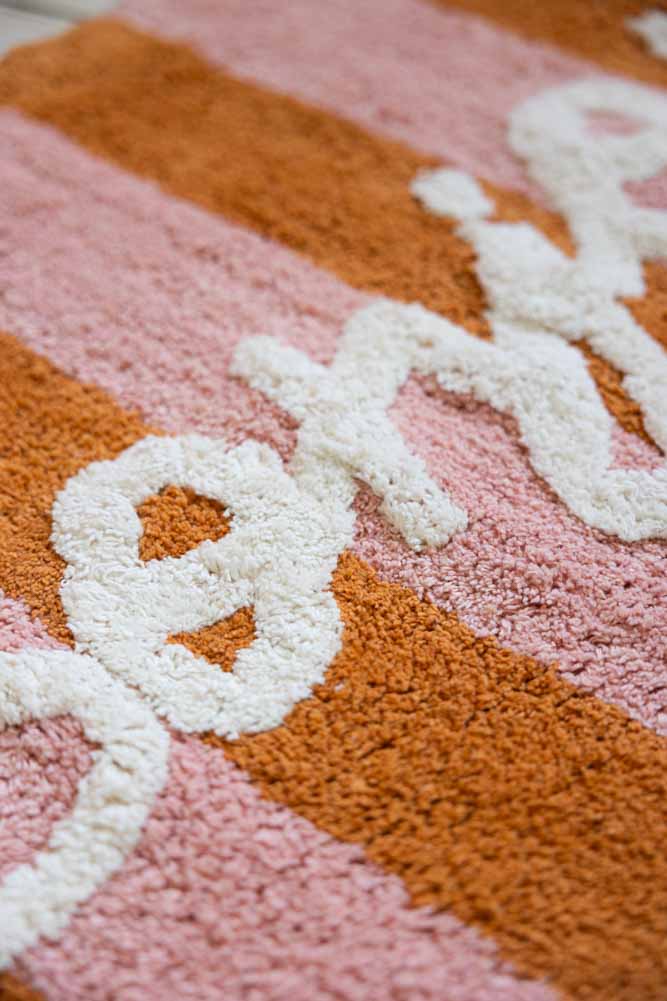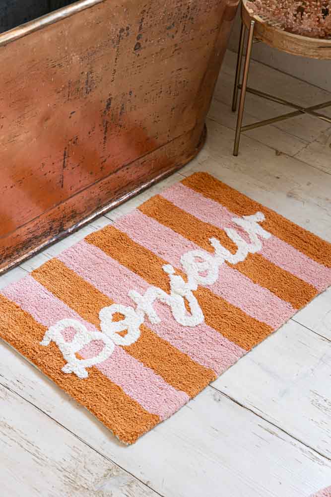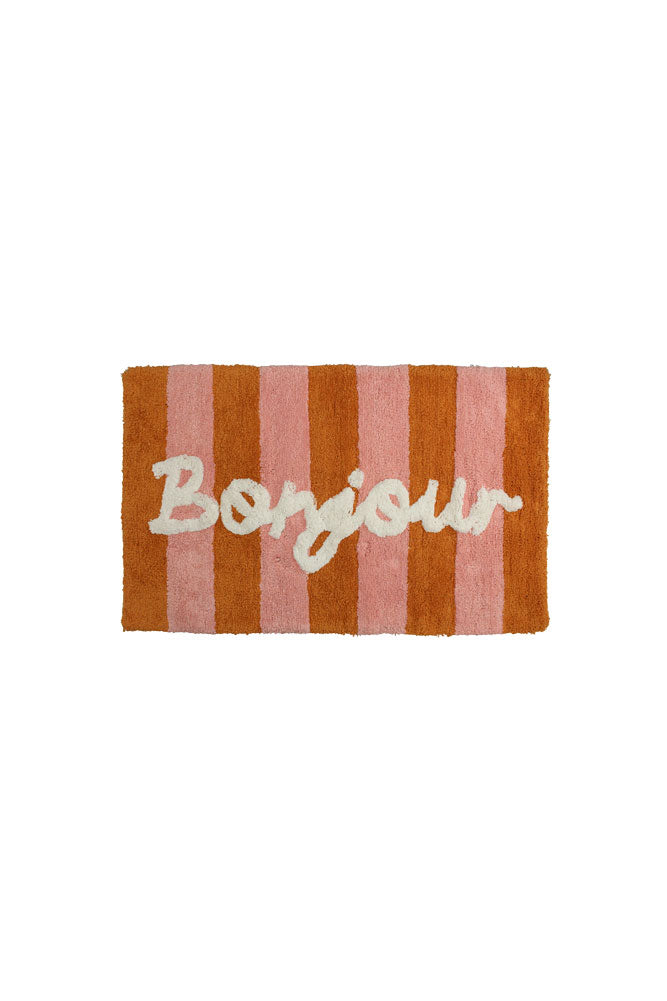 Introduce a hint of French fancy to your bathroom with the Bonjour Bath Mat. Fun bath mats are the secret to bringing a sense of personality to your bathroom space on any budget. Whether you rent your home or want to jazz up your existing decor, this statement accessory instantly transforms your bath/shower area with a playful pop of colour. With an orange and pink striped background, the bath mat stands out against both neutral spaces and darker bathrooms. In addition, the word “Bonjour” is featured across the centre to help start your day in style every day of the week. So, if you are looking for an affordable way to bring a colourful wow factor feature to the bathroom, look no further than this très chic bath mat!