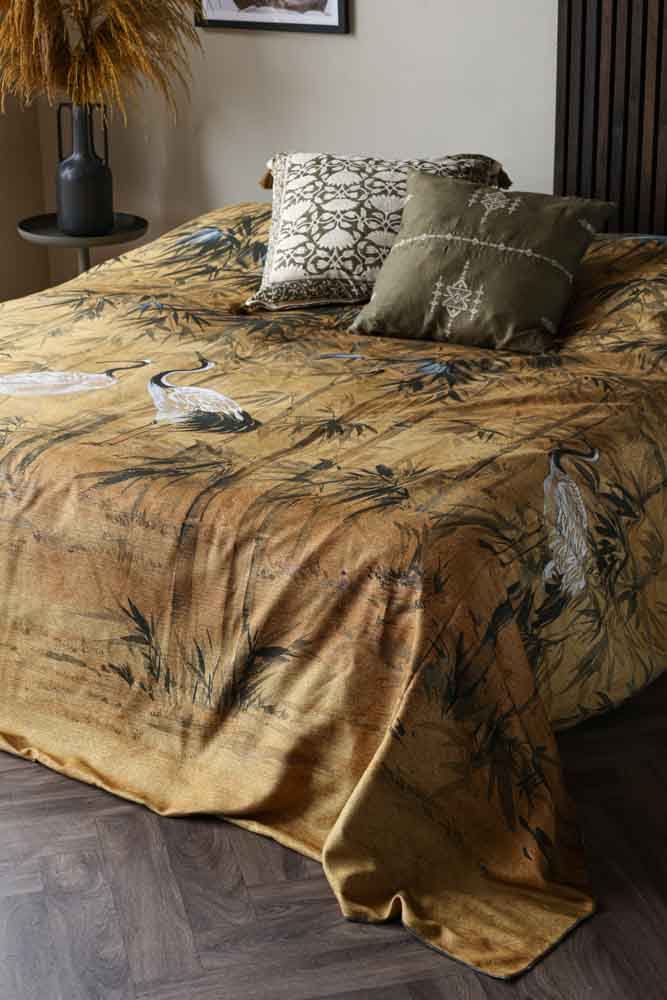 The Cedomin Quilt Tapestry Throw in Clow will make an eye-catching statement in your interior scheme. Measuring 280cm in height and 280cm in width, this large throw blanket showcases a scene of beautiful crane birds in a forest of bamboo. Featuring an earthy yellow backdrop, this Chinoiserie-style throw is made from heavy cotton, viscose and linen. Offering a range of styling options, this cotton throw is large enough to be used to create an extraordinary wall mural that fills an entire large wall in your home.