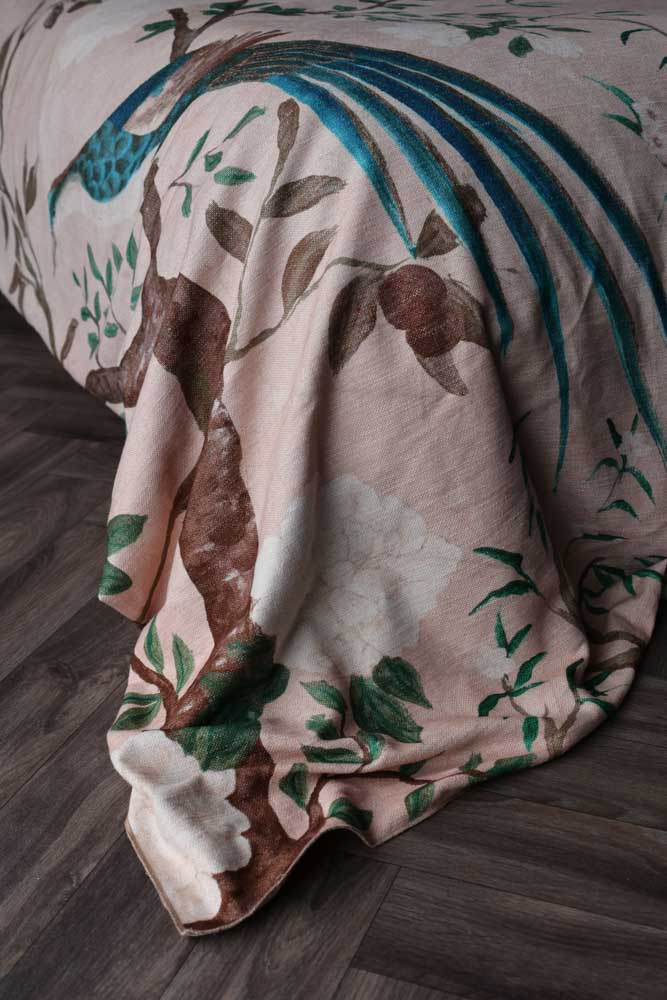 Showcasing a glorious Chinoiserie-style design, the Cedomin Quilt Tapestry Throw In Pink will create unique impact wherever you choose to style it. Measuring 280cm in height and 280cm in width, this large throw blanket showcases elegant peacocks perched in a blossom tree. Featuring a pretty light pink backdrop, this Chinoiserie throw is made from heavy cotton, viscose and linen. Offering a range of styling options, this cotton quilt is large enough to be used to create a striking wall mural that fills an entire large wall in your home.