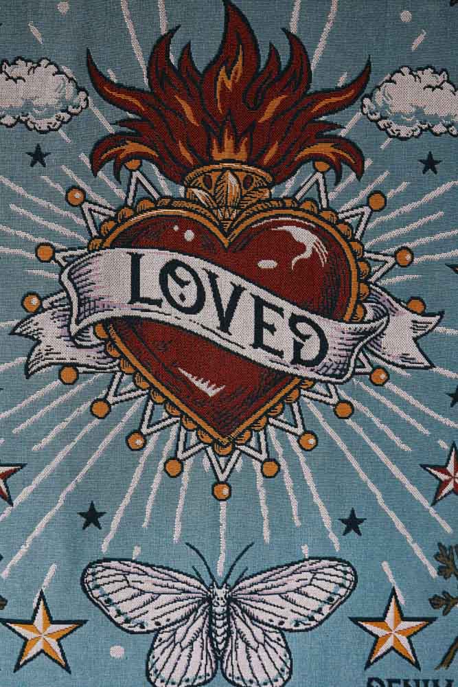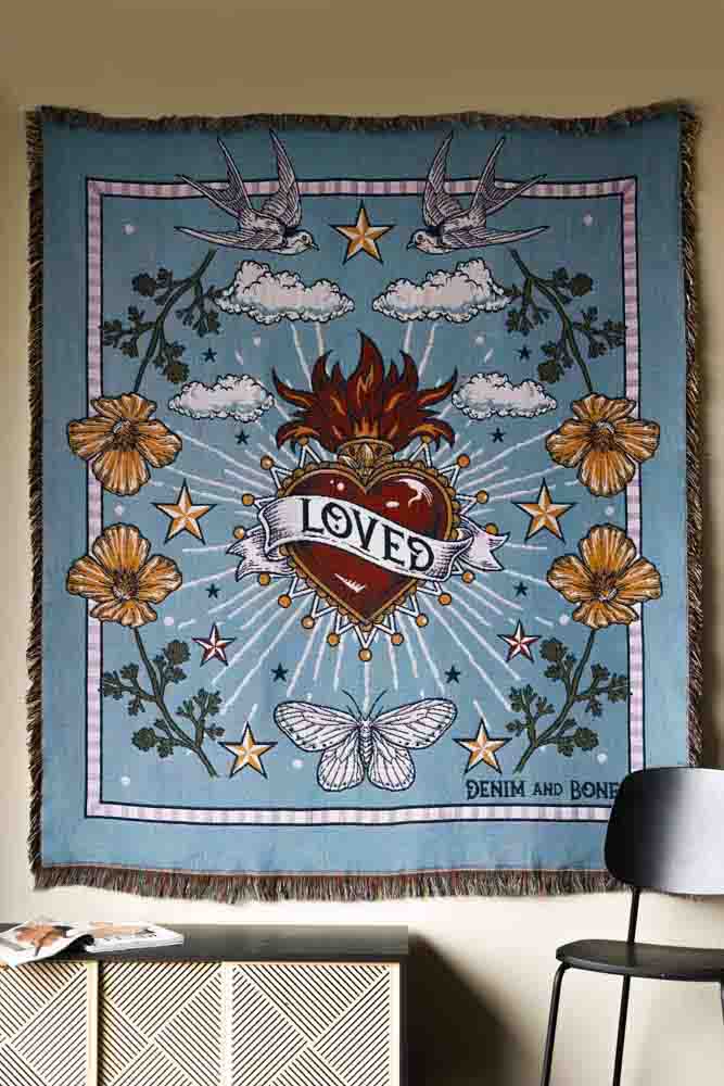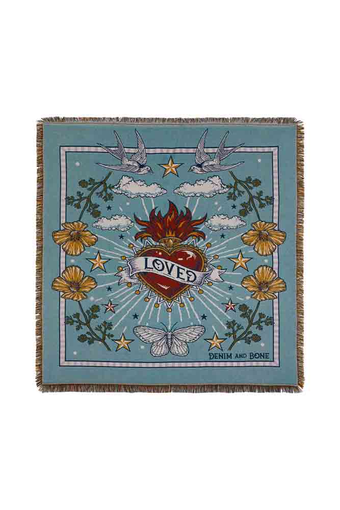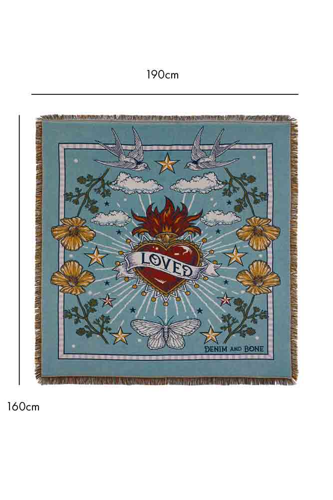 Magnificently maximalist, the Denim & Bone Blue Loved Woven Cotton Throw will make a striking statement in your home. This colourful throw is made from 100% cotton showcasing a heavenly design of a rich Milagros style heart, wild poppies, swallows, moths and clouds. What’s more, this cotton throw features a mixture of black and yellow thread fringe on the sides and a multicoloured fringe on the top and bottom. This large cotton throw measures 160cm in width and 190cm in length.
