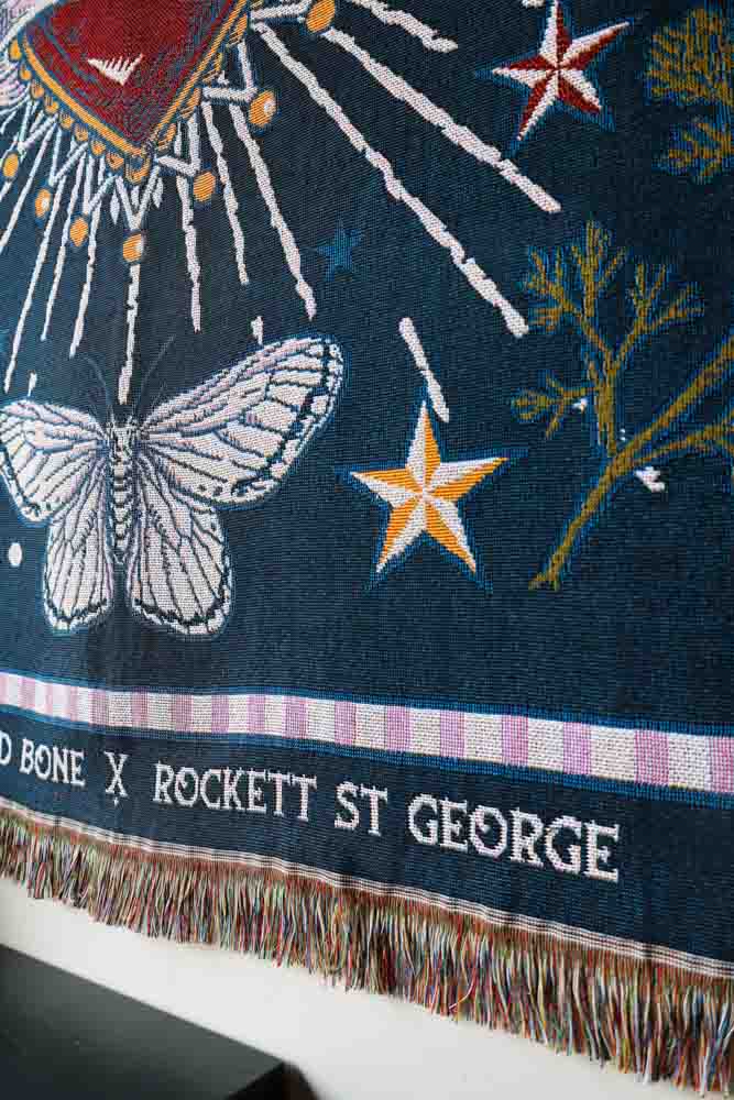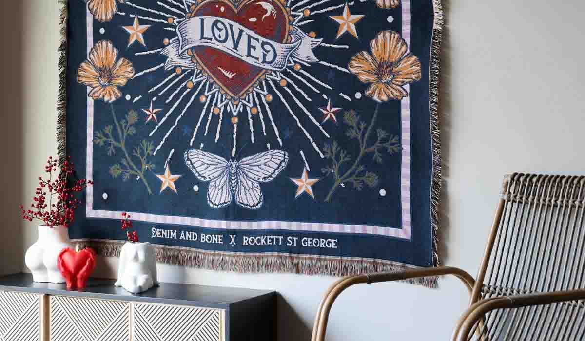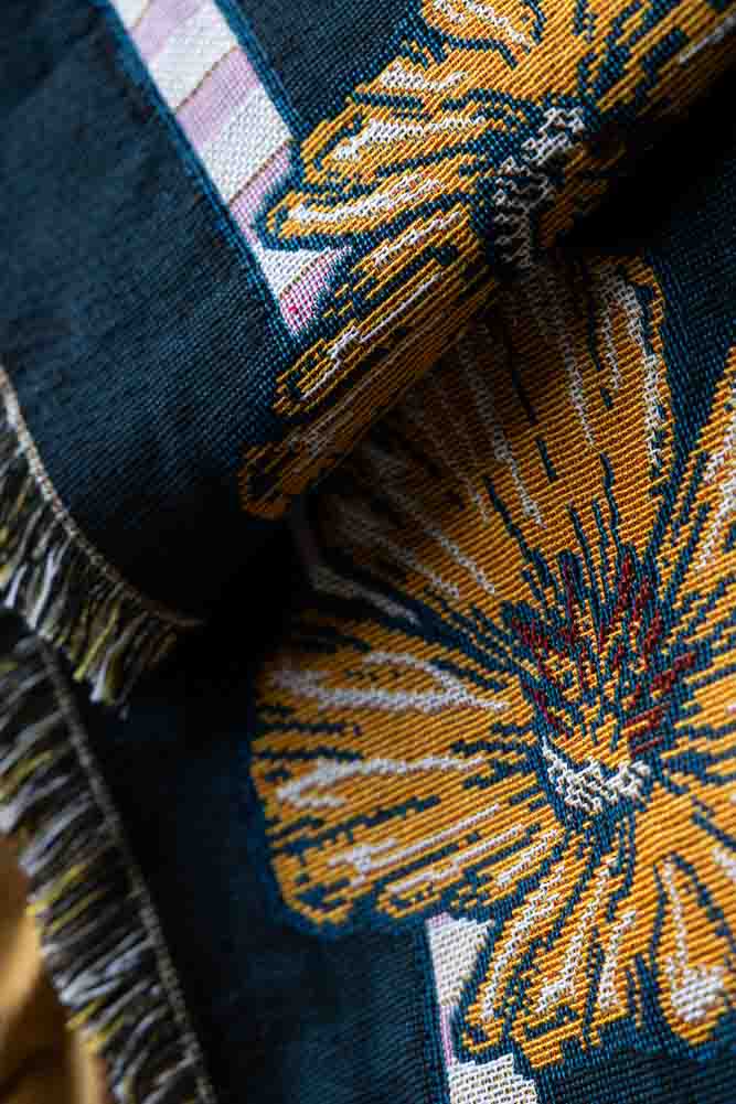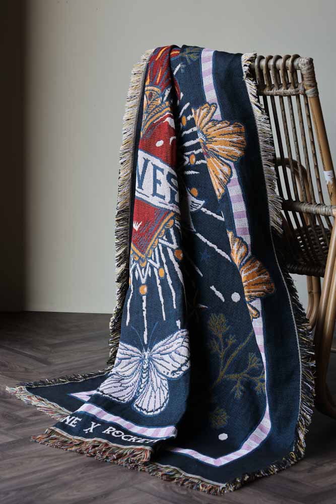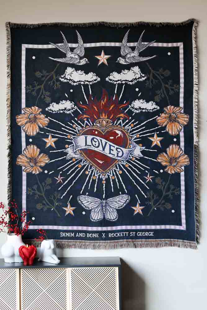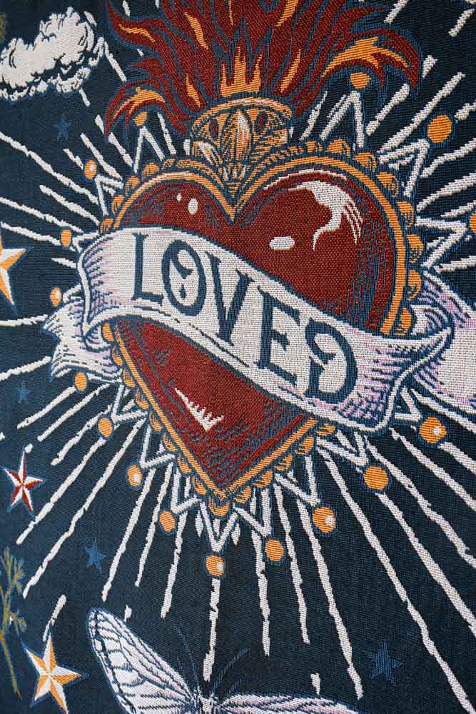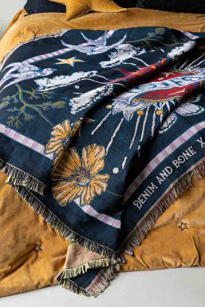 Adding a comfy layer to your beds or sofas, the Denim & Bone Midnight Blue Loved Woven Cotton Throw showcases a magnificently maximalist design. Working in partnership with Rockett St George, this beautiful woven throw is made from 100% cotton showcasing a heavenly design of a rich Milagros style heart, wild poppies, swallows, moths and clouds on a midnight blue background. What’s more, this cotton throw features a mixture of black and yellow thread fringe on the sides and a multicoloured fringe on the top and bottom. This large cotton throw measures 160cm in width and 190cm in length.