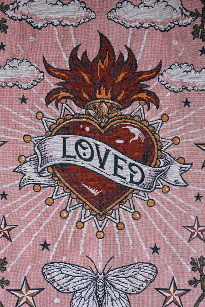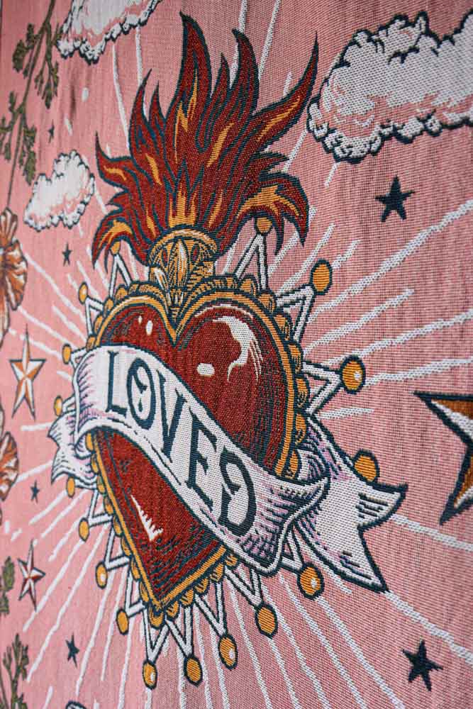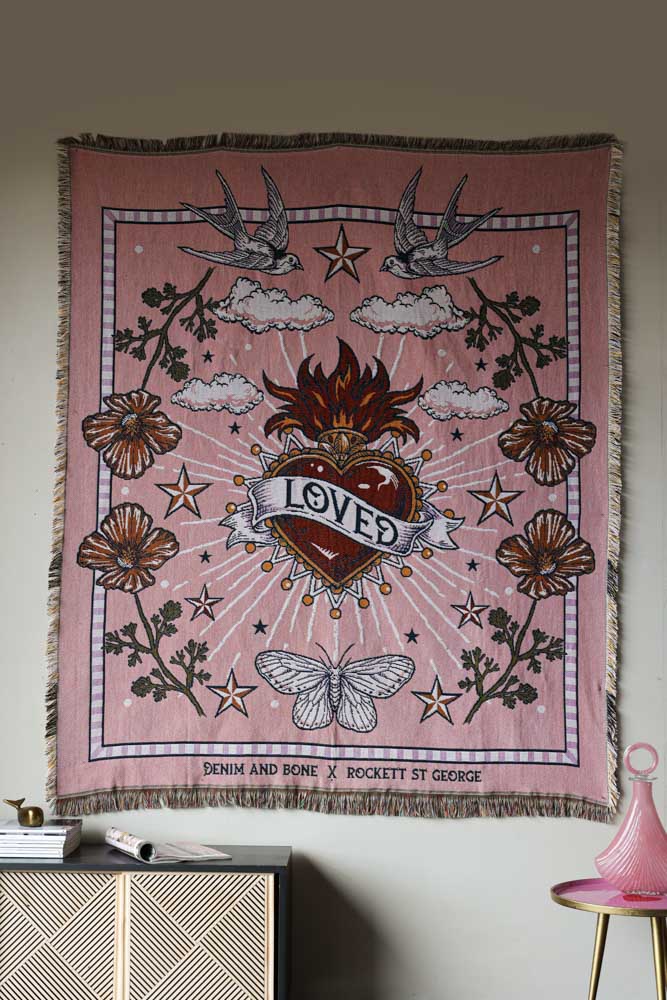 Working in partnership with Rockett St George, the Denim & Bone Pink Loved Woven Cotton Throw will add an oh-so-comfy layer to your sofas or beds. Showcasing a gorgeous vintage design, this beautiful woven throw is made from 100% cotton showcasing a heavenly design of a rich Milagros style heart, wild poppies, swallows, moths and clouds on a pretty pink background. What’s more, this cotton throw features a mixture of black and yellow thread fringe on the sides and a multicoloured fringe on the top and bottom. This large cotton throw measures 160cm in width and 190cm in length.