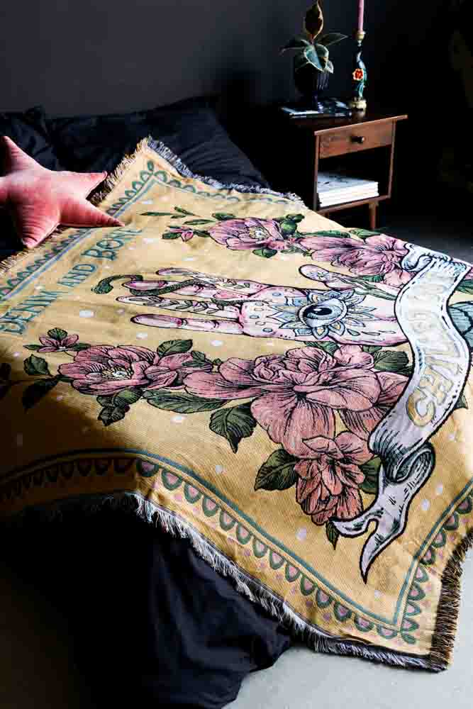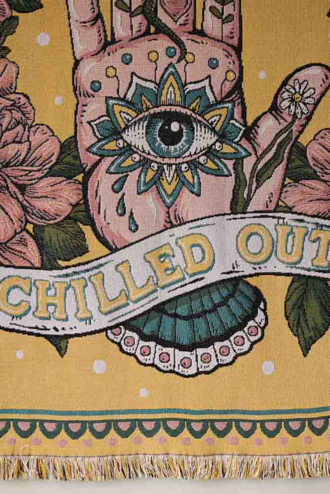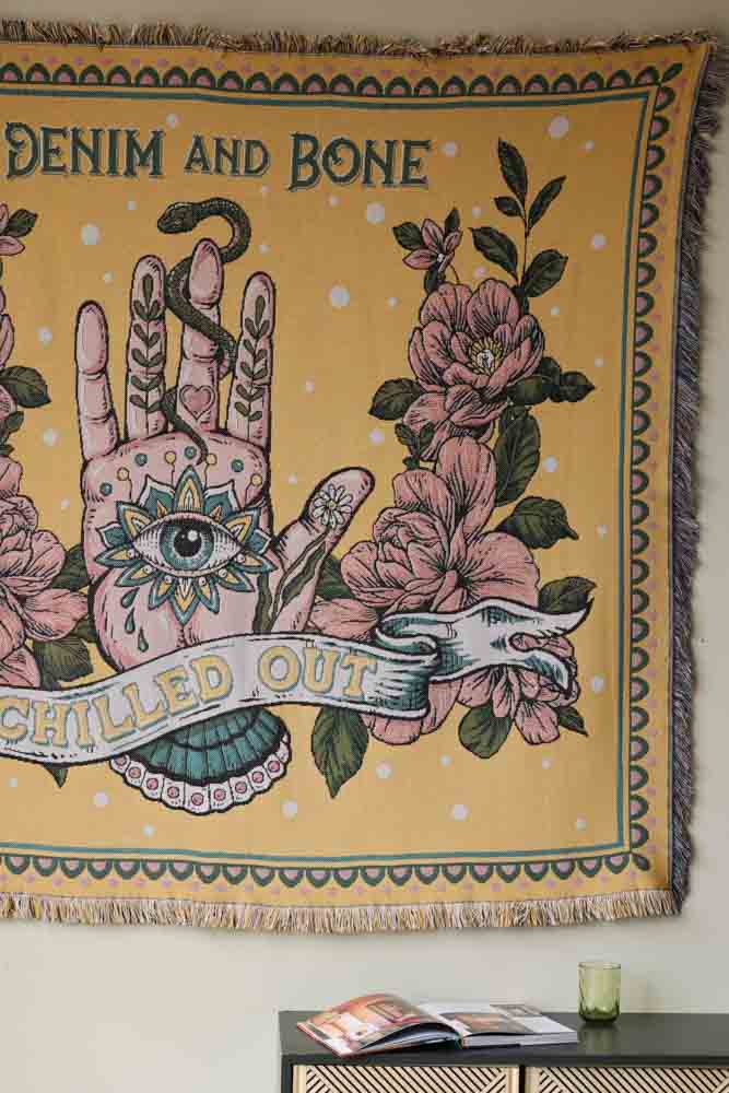 Another beautiful design from the brilliant Daisy Harkness, the Denim & Bone Yellow Chilled Out Throw joins our collection alongside the Loved Denim & Bone Throws. Made from 100% cotton, the throw blanket features an iconic Hamsa symbol in the centre, surrounded by flowers with the slogan ‘Chilled Out’ woven across the bottom of the design. Measuring W190cm x L160cm this versatile throw can be used throughout your home, both inside and out in the garden.