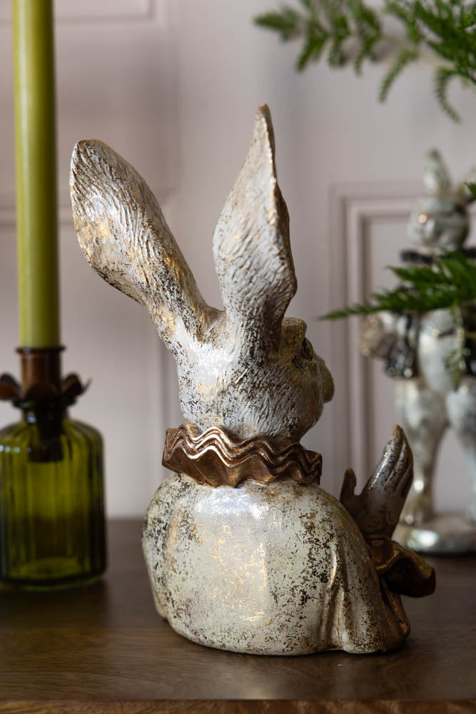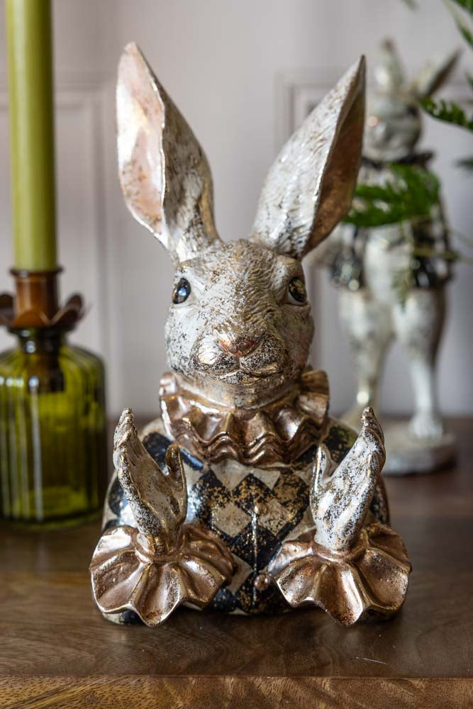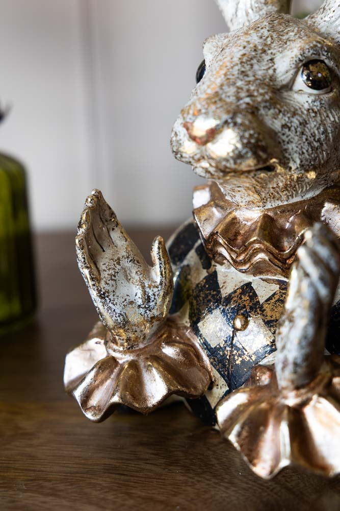 Okay, but have you ever seen a rabbit this fabulous? Meet your new favourite ornament - the Fabulous Applauding Rabbit in all its black and gold, harlequin-patterned, eerily enchanting glory. With big, dramatic ears, extravagant gold cuffs, and human-like hands poised to applaud, this is not just any ornament - it's a full-on performance. Dripping in Alice In Wonderland magic with a touch of the surreal, this show-stopping rabbit is here to add whimsy, drama and the perfect amount of weirdness to your home. So, whether you're decking out your home accessories for Easter or just appreciate a little eccentric charm all year round, this rabbit is late for a very important date... in your home.